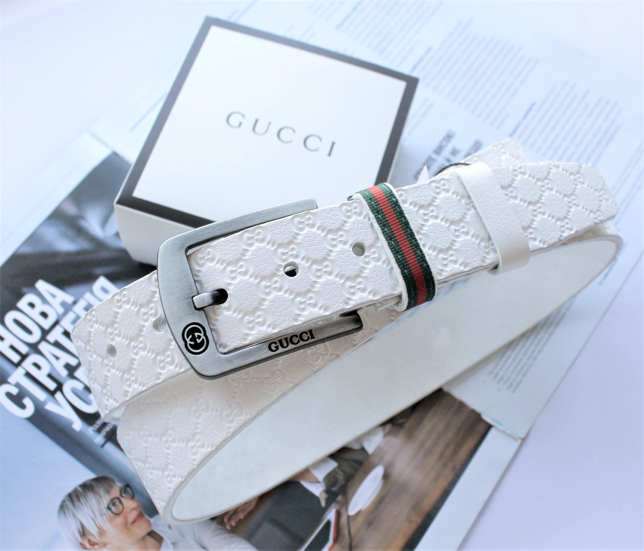 Чоловічий шкіряний ремінь з тисненням GG білий